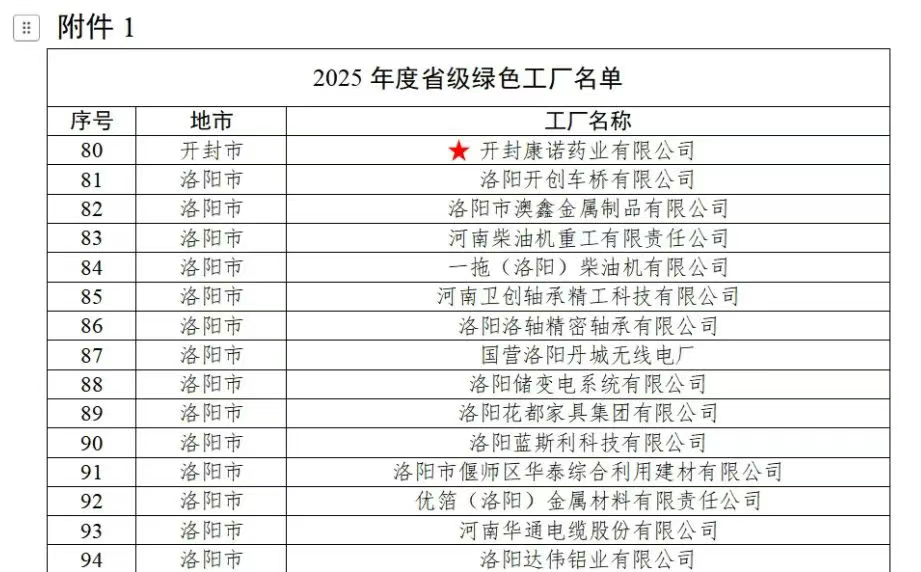 近日,河南省工業(yè)和信息化廳正式發(fā)布2025年度省級綠色制造名單。依據《河南省綠色制造體系梯度培育及管理暫行辦法》及相關工作通知要求,開封康諾藥業(yè)有限公司經過嚴格的申報、推薦、專家評審和公示程序,成功獲評“2025年度省級綠色工廠”。